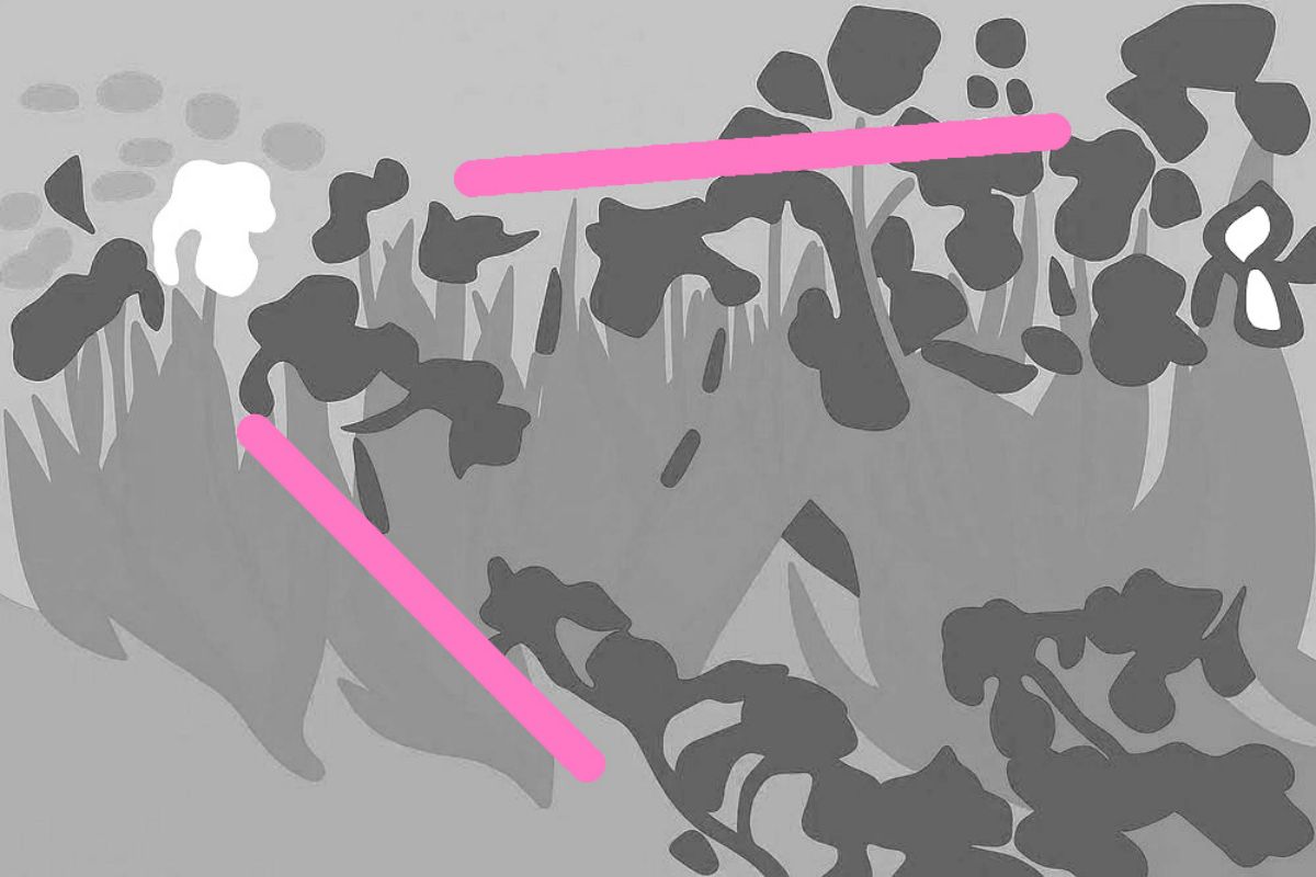 Le point focal est renforcé par la concentration des teintes vives, qui émergent au milieu de verts et de bleus plus doux. Les formes des fleurs, tantôt arrondies, tantôt anguleuses, offrent un rythme visuel varié et évitent toute monotonie. Cette combinaison entre masses colorées, lignes souples et contrastes de valeurs maintient l’œil en mouvement à travers la composition.