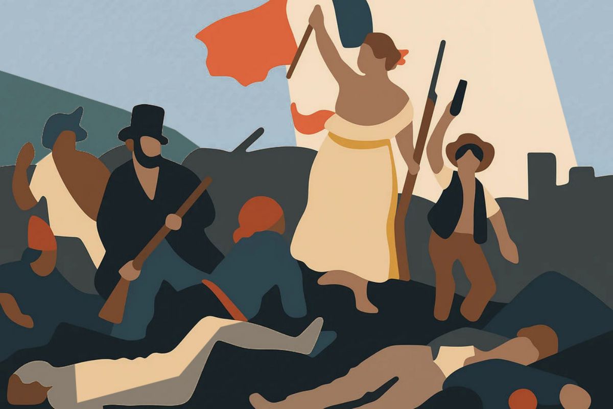 Le drapeau tricolore, brandi au-dessus des personnages, prolonge le point focal et guide le regard vers la Liberté. Les formes varient entre les masses compactes du peuple et les silhouettes élancées, créant un rythme visuel puissant. Les lignes diagonales et les contours partiellement fondus dans la fumée amplifient le mouvement, unifiant la composition dans un élan ascendant.