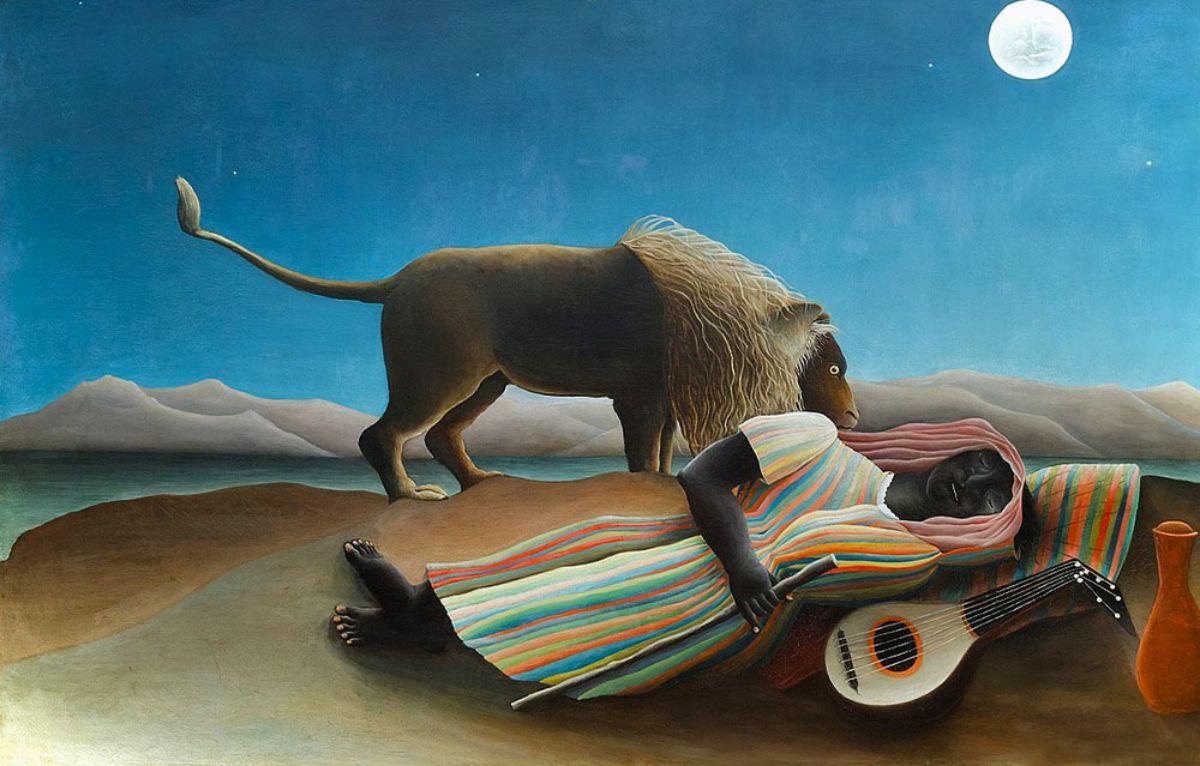 Une figure solitaire reposant sous un ciel étoilé, veillée par un lion placide : une scène étrange, à la fois inquiétante et paisible. En reproduction artisanale peinte à la main, elle apporte toute la poésie silencieuse du Douanier Rousseau.