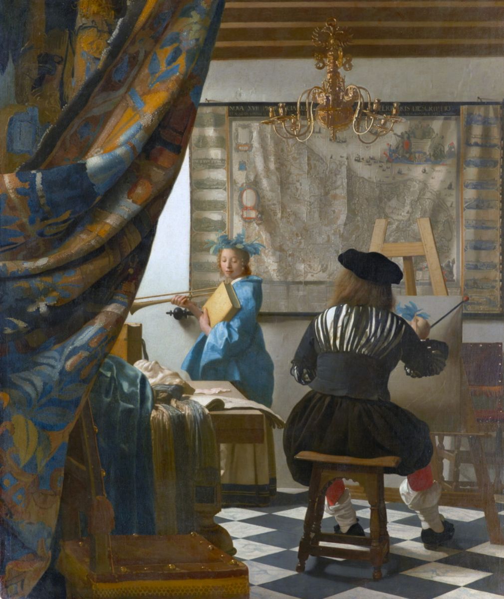 Scène d’atelier raffinée où Vermeer se met en scène lui-même, rendant hommage au statut du peintre.
