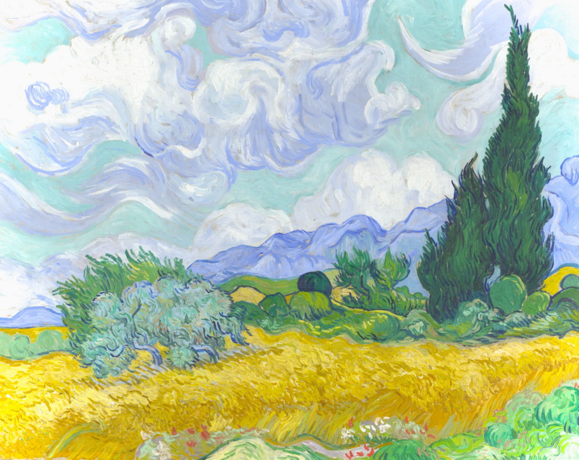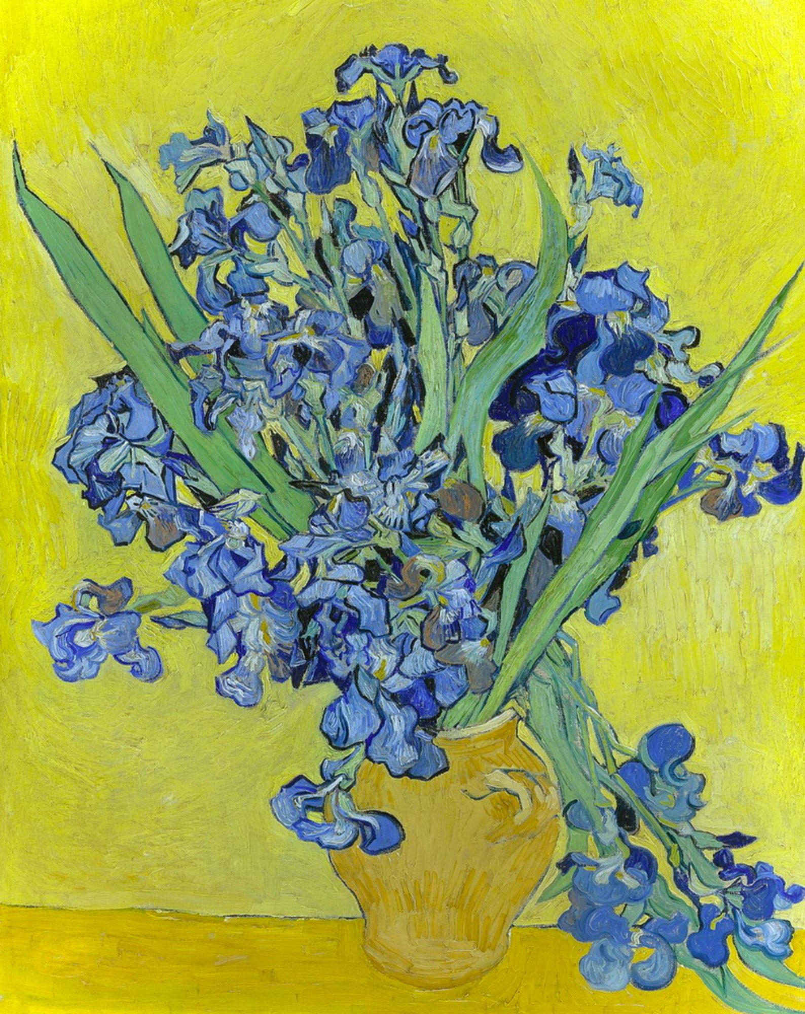 Massif floral foisonnant, rendu avec des bleus profonds et des verts puissants. Cette copie met en valeur le travail sensible de Van Gogh sur la nature et ses motifs récurrents.