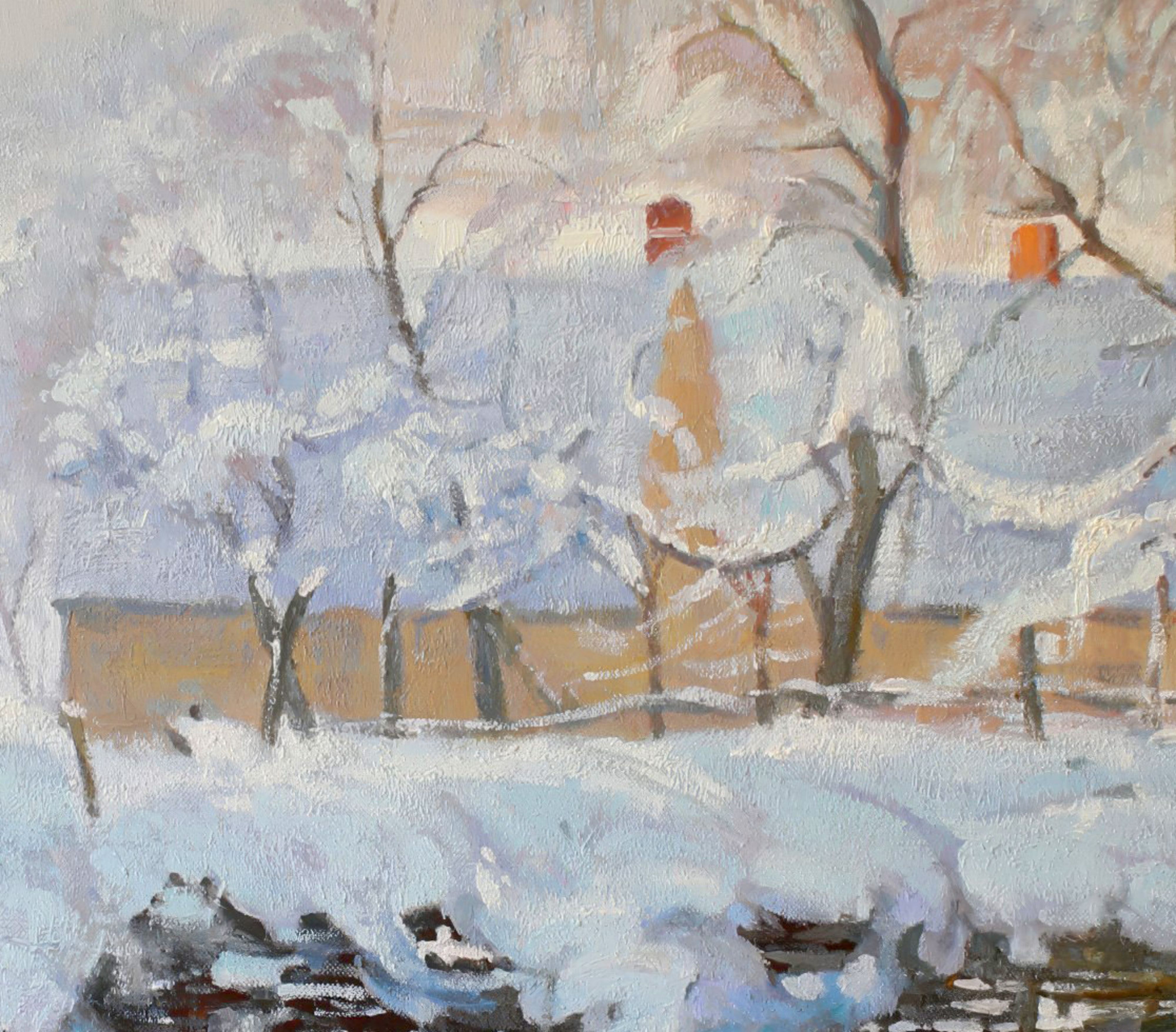 The material is built up in visible layers, sometimes with a palette knife, sometimes with a brush, with more heavily loaded areas and others that are more blended.