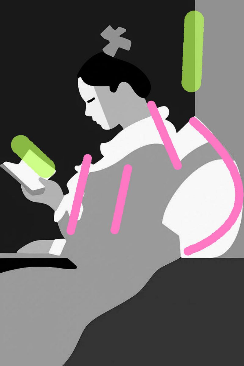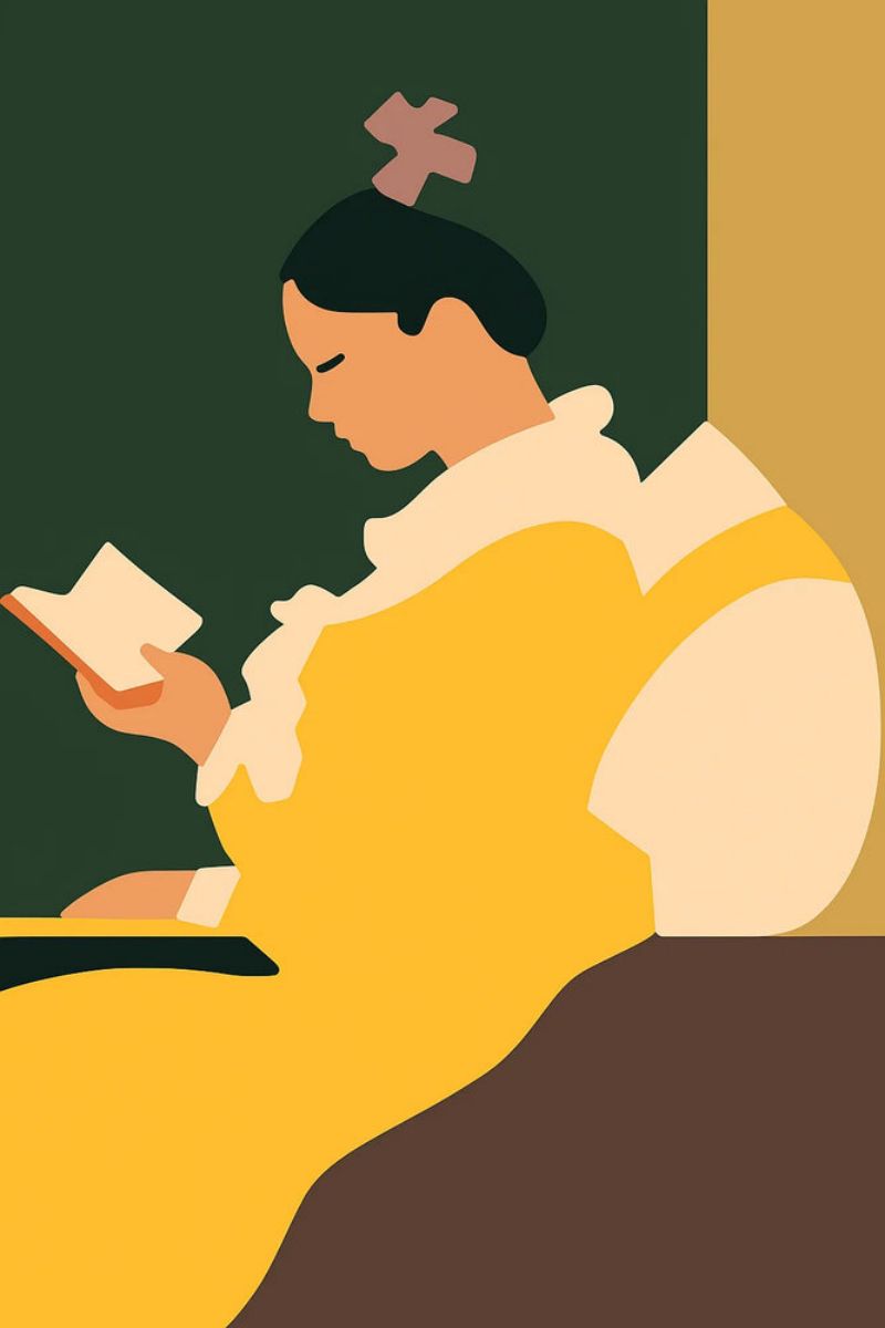 The reader’s compact, stable silhouette contrasts with light details of dress and cushion. Focus increases through converging lines — arm, book, gaze — toward the reading gesture. Wide masses and subtle details yield a harmonious, refined rhythm.