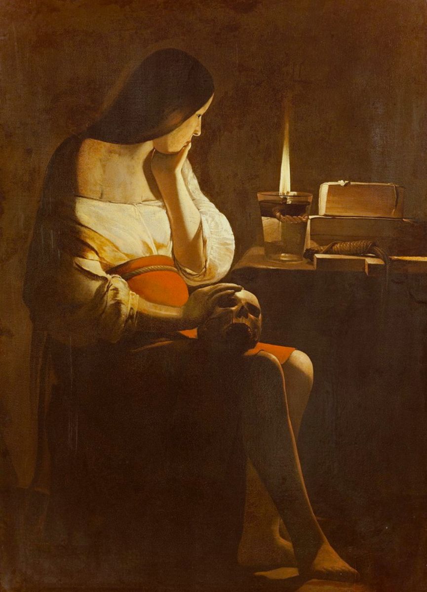 A meditative icon where the flame illuminates both repentance and the vanity of worldly things. In an artisanal reproduction, this work invites quiet contemplation.