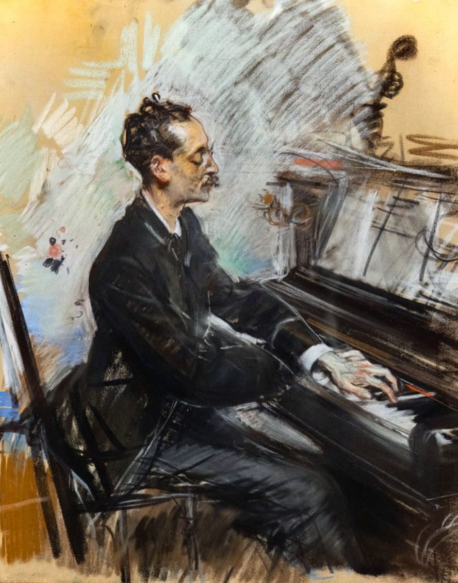A portrait alive with both musical and pictorial virtuosity — the brush translates the very rhythm of performance. In a hand-painted reproduction, the model’s energy and Boldini’s nervous stroke come vividly to life.