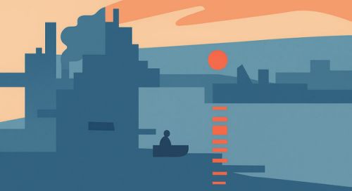 The focal point centers on the sun — the only element fully saturated in color — emerging from the mist of the harbor. Around it, the dark silhouettes of boats and the verticals of masts guide the eye and connect sky to water. This visual hierarchy, based on soft but effective contrast, directs attention without rigidity.