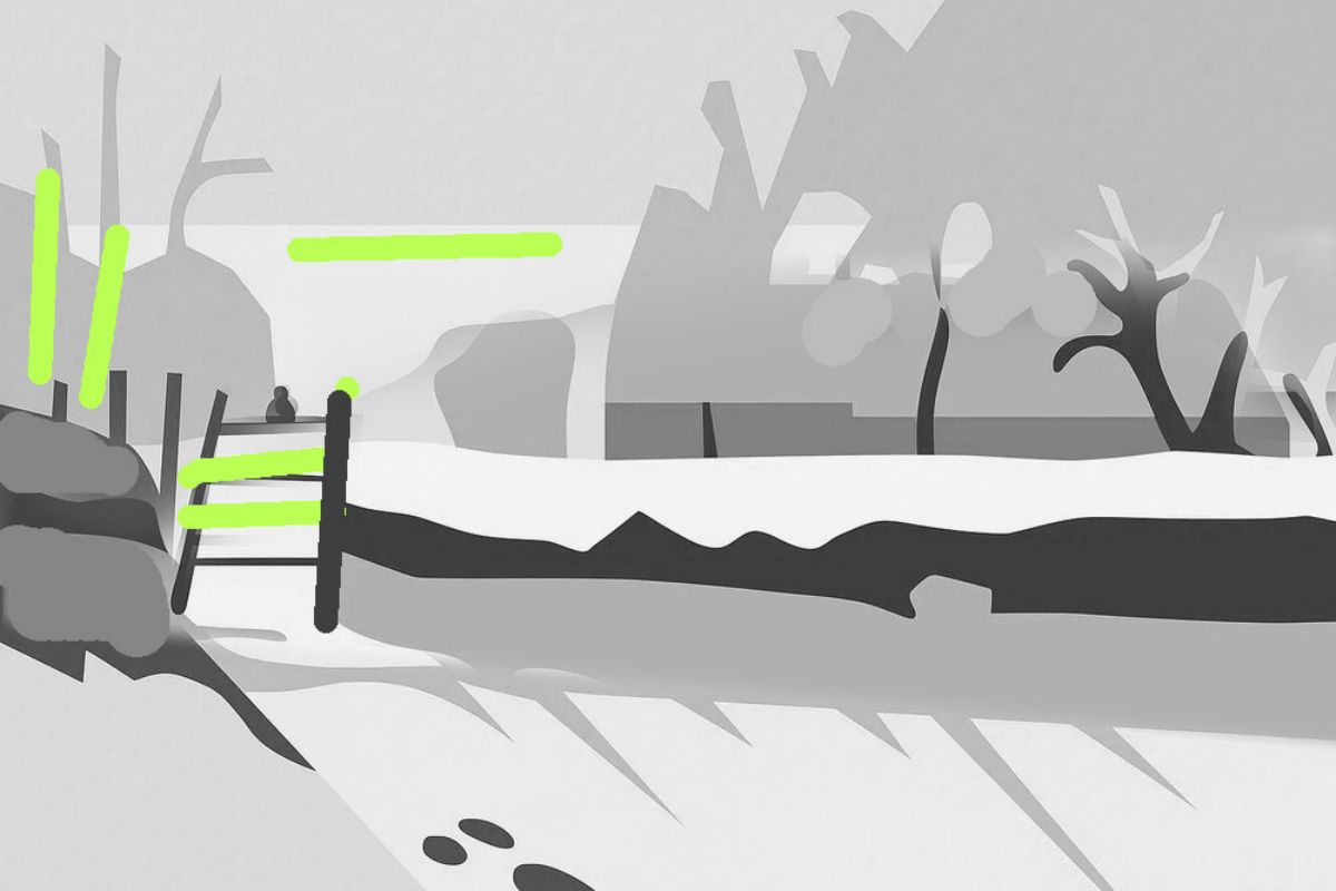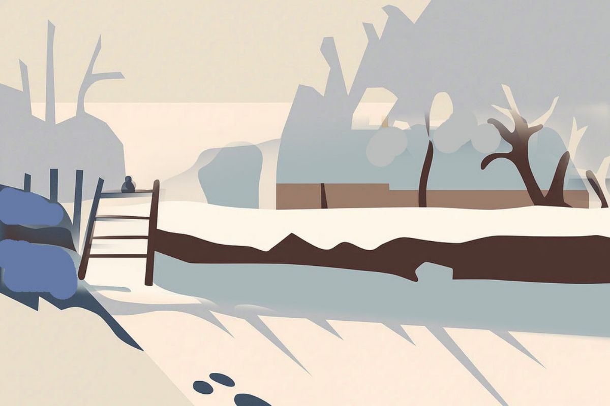 The light masses of snow dominate the composition, structured by bluish shadows and the dark lines of the trees. The slightly oblique wooden fence anchors the depth of the scene. The small black silhouette of the magpie, perched along this line, creates a discreet yet essential visual centre. Everything relies on the accuracy of the values and the coherence of the visual rhythm.