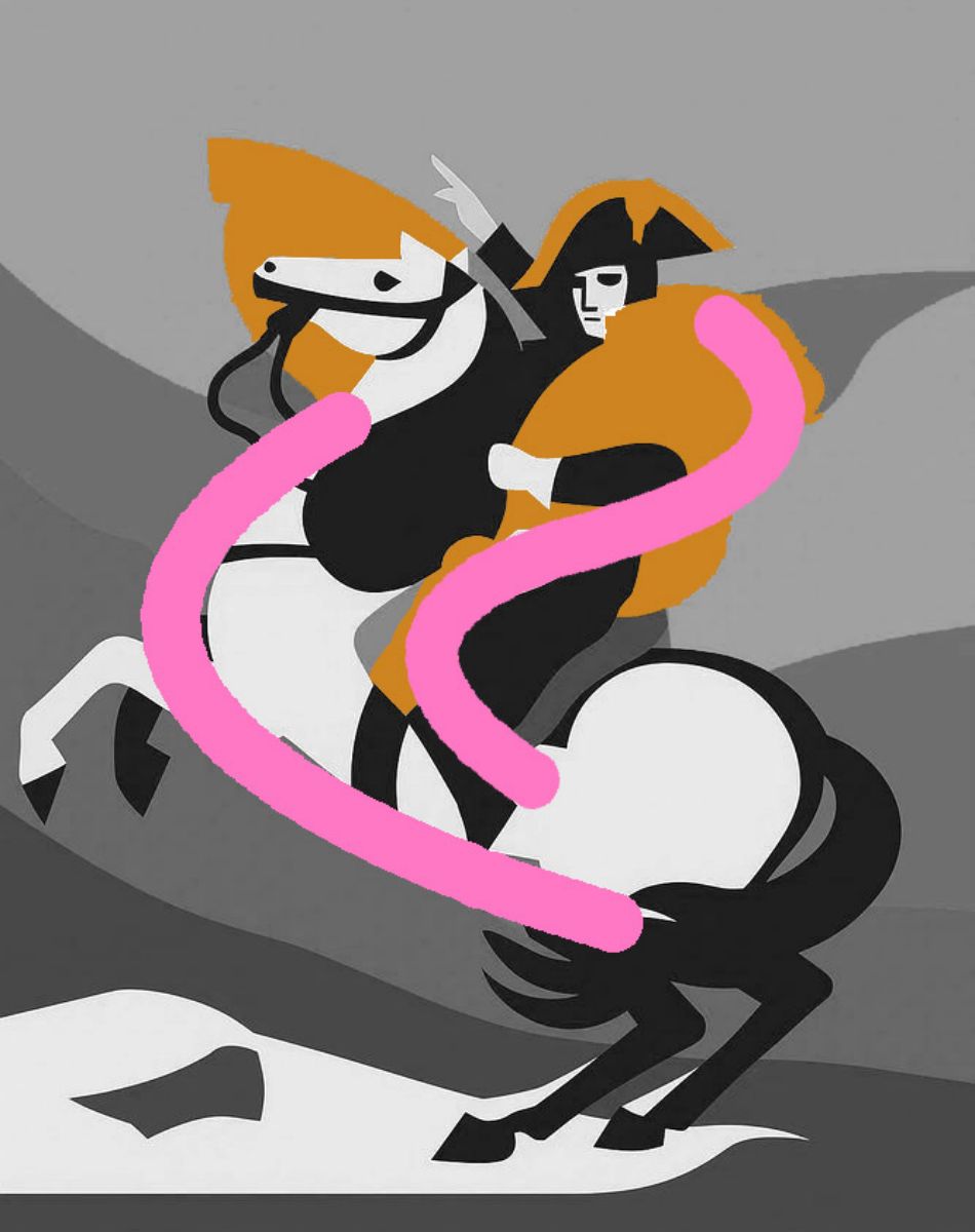 Values structure the scene. The white horse and Napoleon’s light cloak dominate space and detach from a stormy dark ground. This contrast drives the reading and heightens the heroic charge. The mount’s ascending diagonal, reinforced by the cloak’s folds, creates upward thrust, as if the figure breaks free from the mountain. Energy, brilliance, and authority unite.