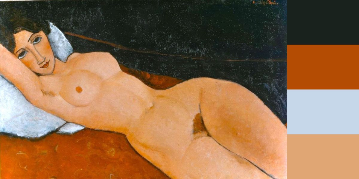 The silhouette is built from elongated, simplified forms typical of Modigliani. The body’s soft lines contrast with the environment’s flatter planes, guiding the eye to the central figure. Rounded, sensual volumes combine with firm contours, reinforcing stability and overall rhythm.