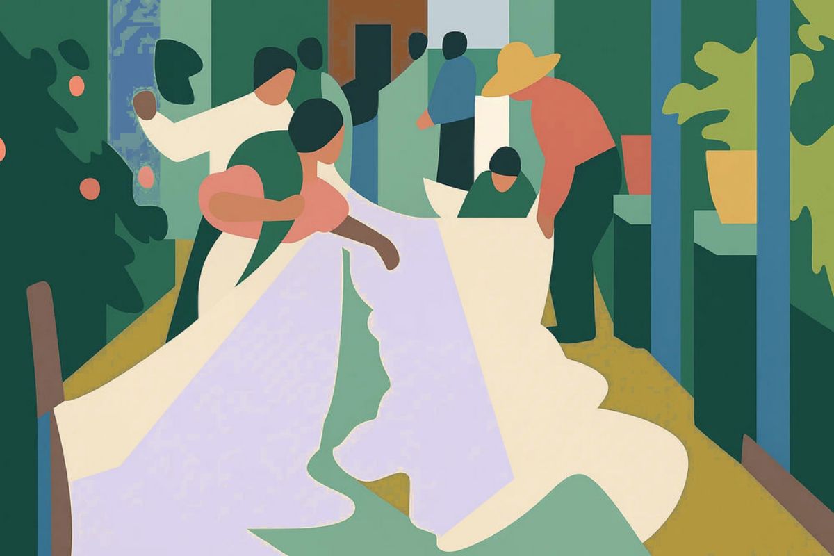 Values center on the huge white sail, a luminous plane that catches and diffuses daylight. Darker fishermen anchor the composition and guide the eye to the action. Diagonals of ropes and gestures balance the sail’s vertical. Mass, movement, and light are in constant dialogue.