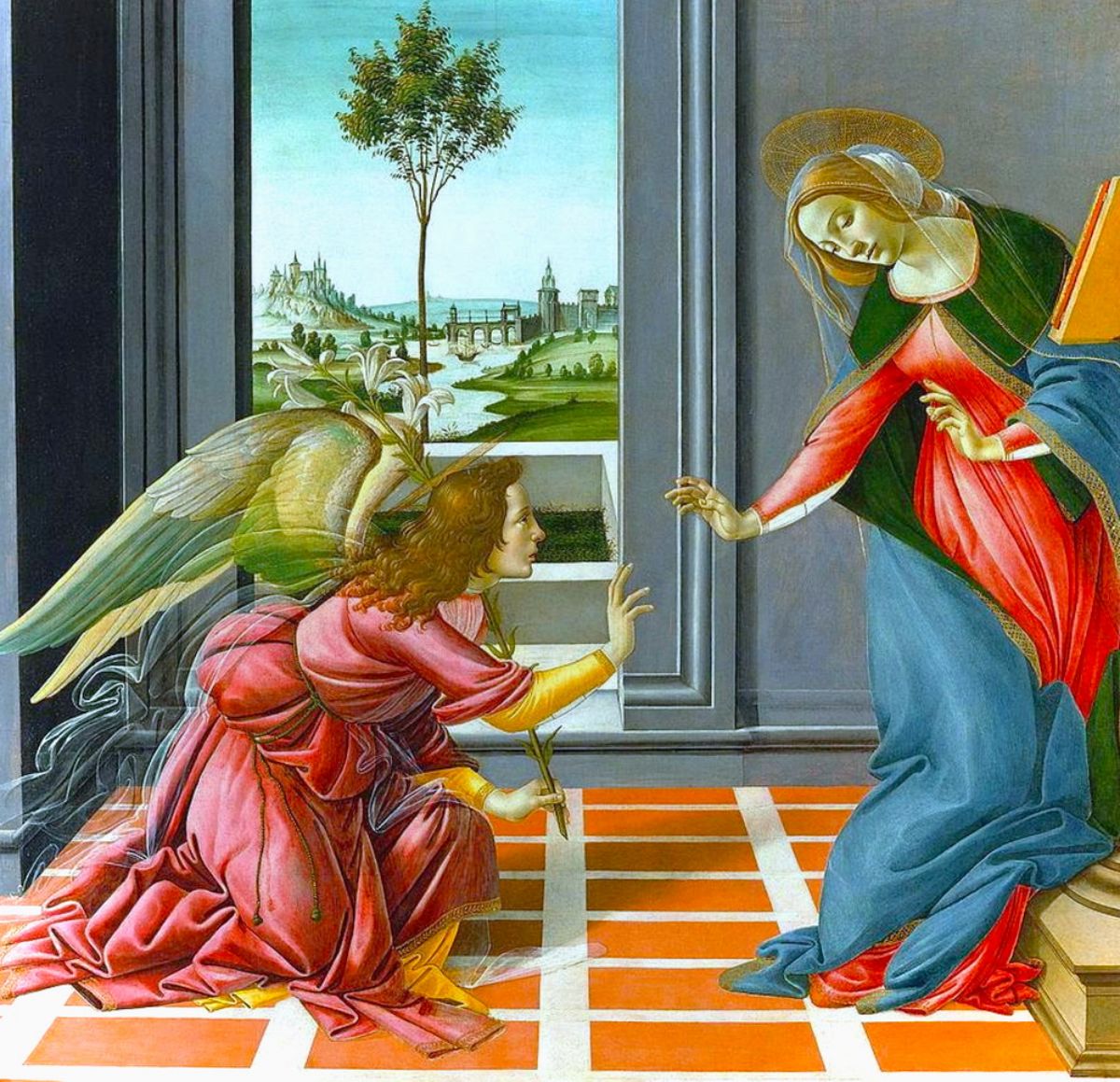 A solemn and luminous dialogue between the angel and the Virgin. The finesse of the drawing and the lightness of the drapery reveal all of Botticelli’s virtuosity.