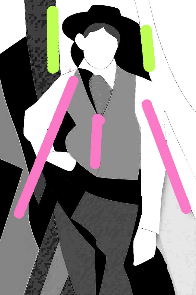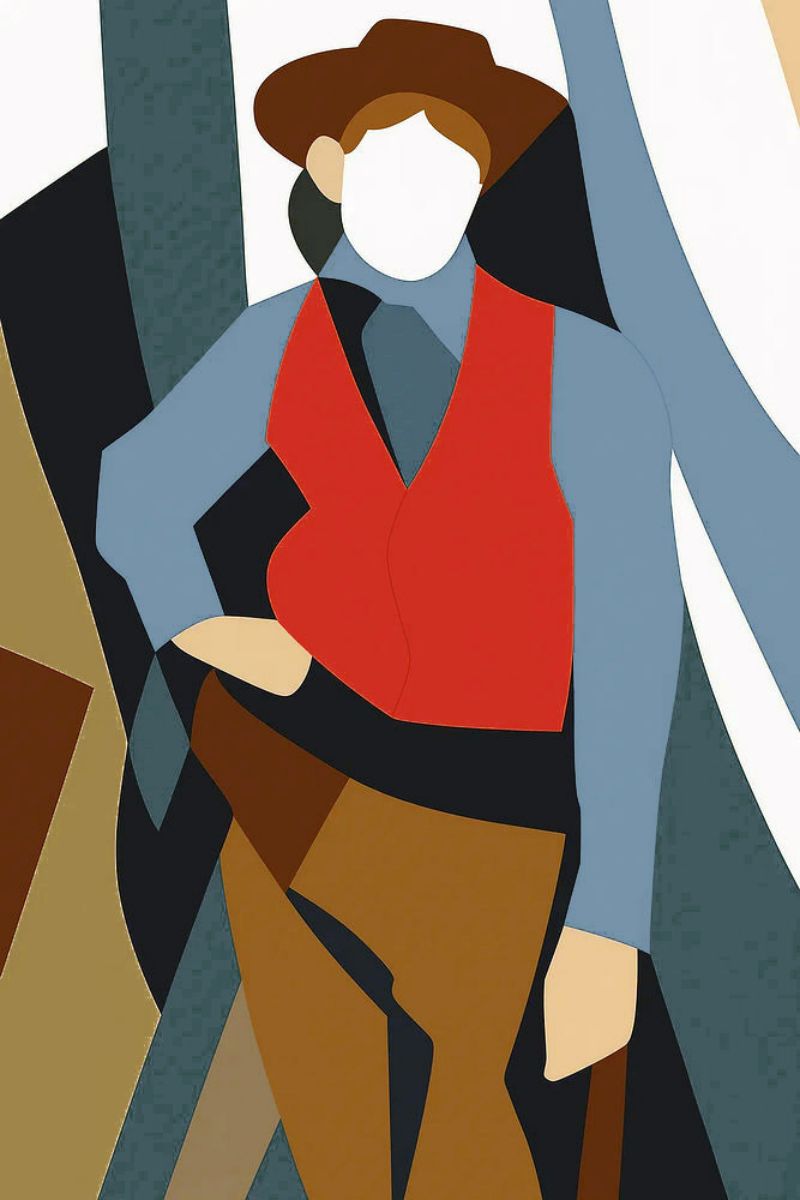 Values oppose the vivid red vest to the darker background, organizing depth. The diagonal of the body and the tilt of the head create balance between tension and calm. Modulated shadows sculpt the figure without breaking chromatic unity. Composition rests on geometric construction of volumes: everything is built, nothing decorative.