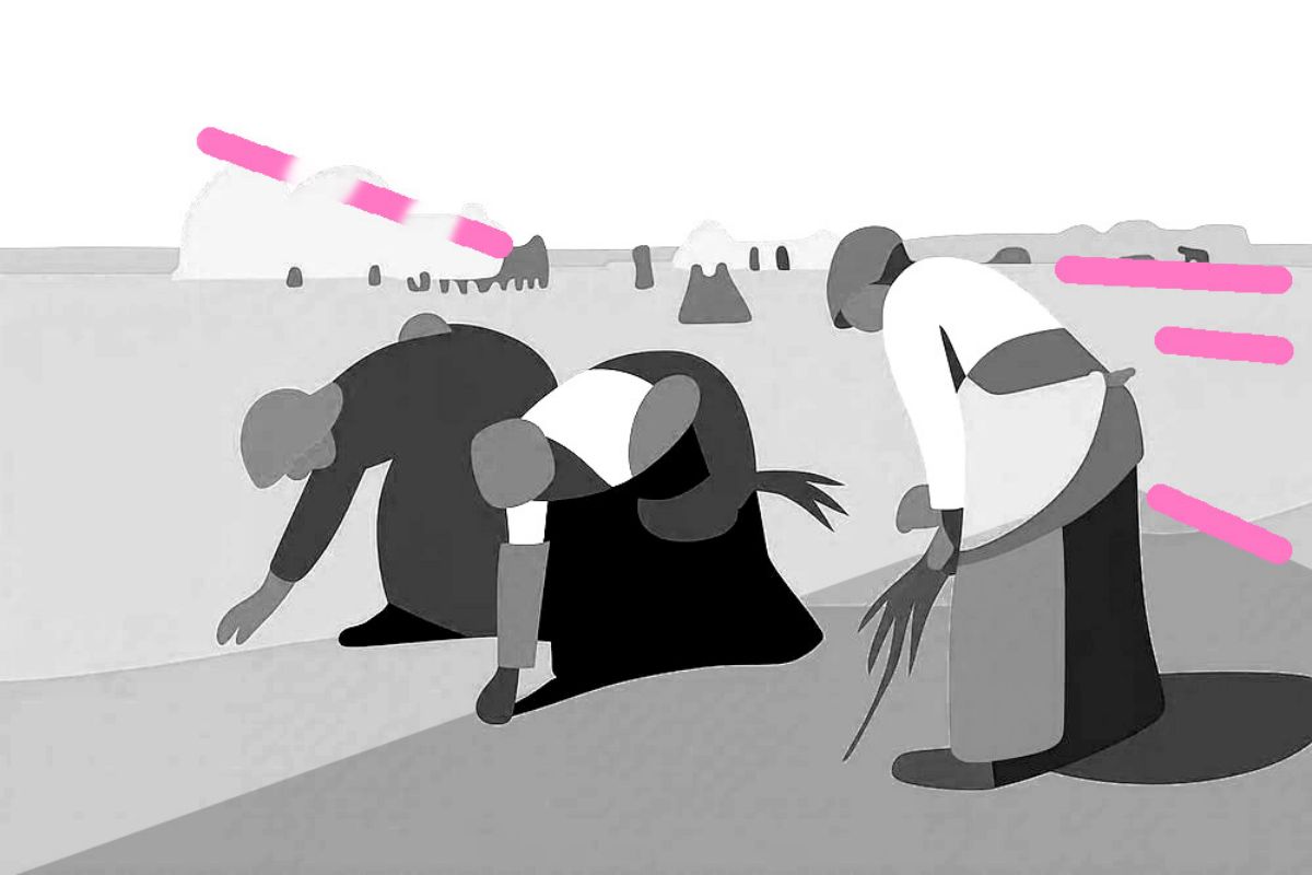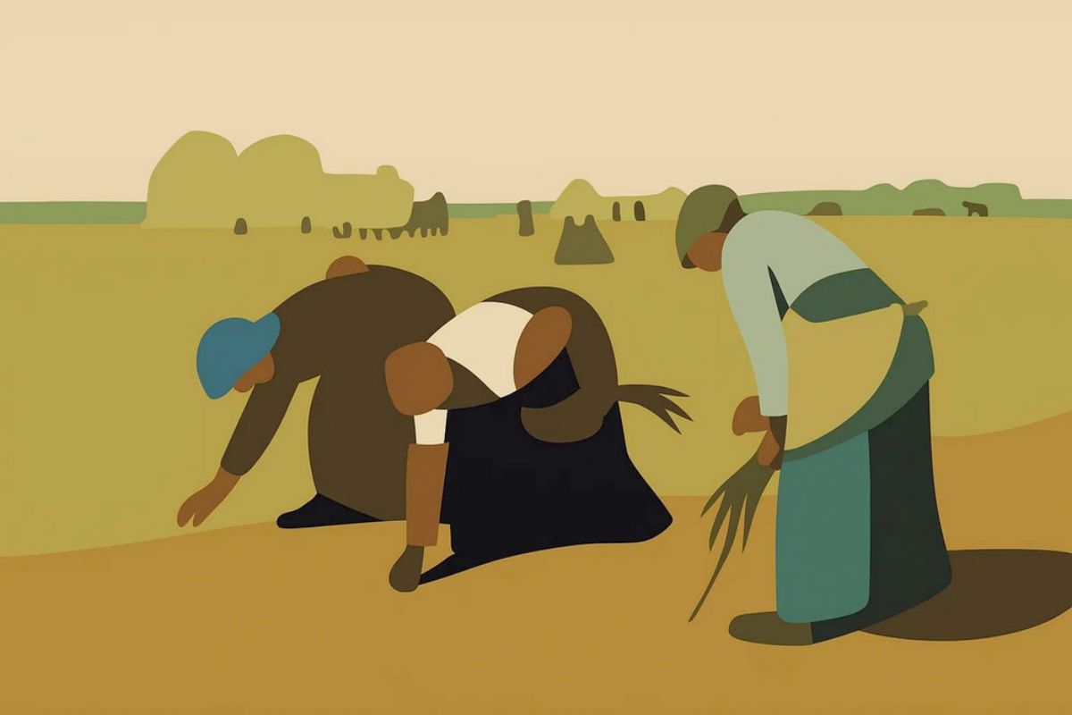 Values are hierarchized between the bright sky and distant fields and the darker zones of the bent bodies. This contrast places the focal point on the three female silhouettes, isolated within luminous space. The large, stable, monumental masses of the figures oppose the diffuse distance, creating tension between the intimate and the vast. The balance of planes strengthens legibility and gravity of the gesture.