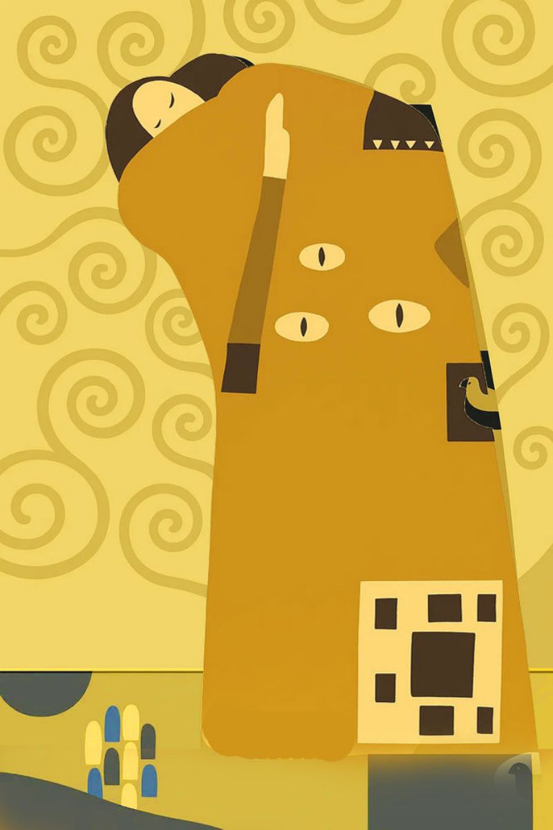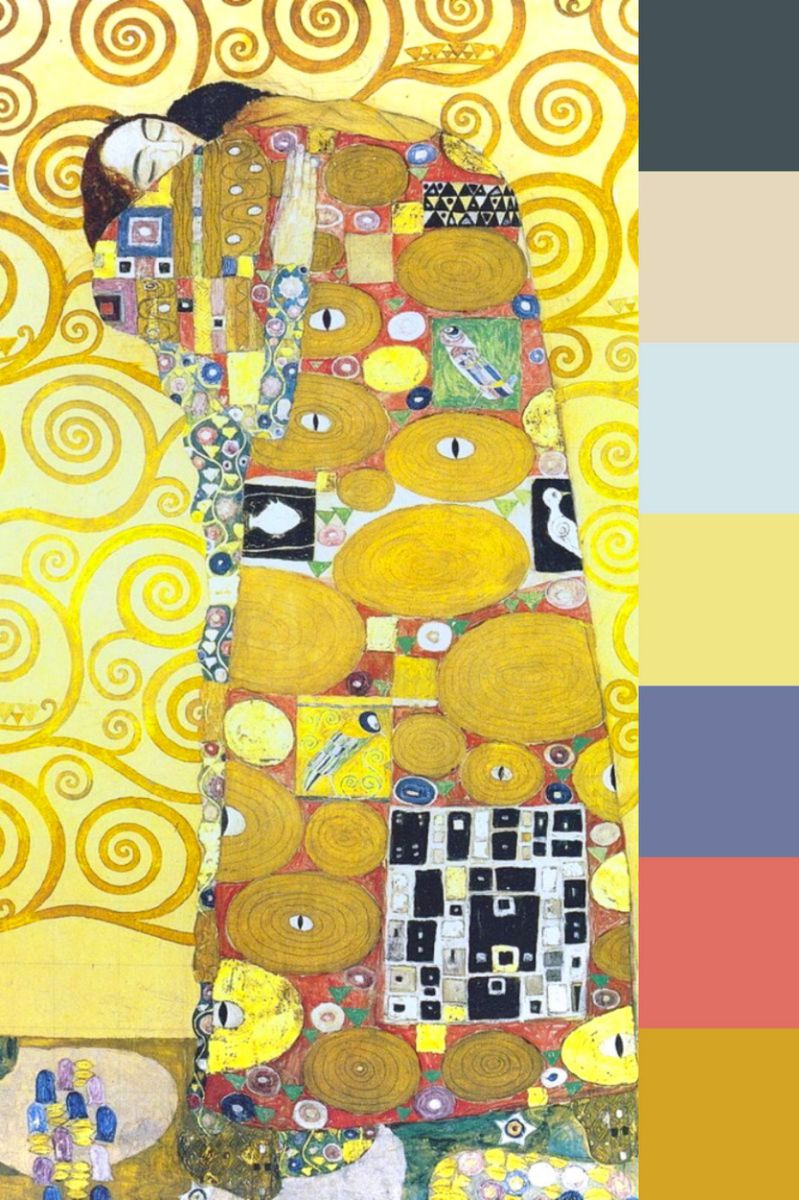 Values rest on luminous gold ground contrasted by darker spiral and figure areas. This play of light and shade brings out the focal point: the tree’s vertical and the “Embrace” silhouette. Forms, dominated by coiling motion, create continuous dynamism. Large gold masses unify the surface while colored motifs pace reading without breaking decorative harmony.