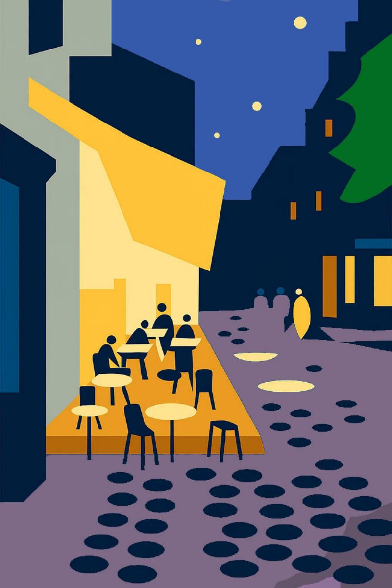 The combination of contrasting values, a luminous focal point and dynamic forms expresses the vitality of modern nightlife. Van Gogh transforms a simple terrace into a theatre of colors and sensations, where artificial light converses with the infinity of the sky. The painting conveys both human warmth and cosmic contemplation, emblematic of his pictorial universe.