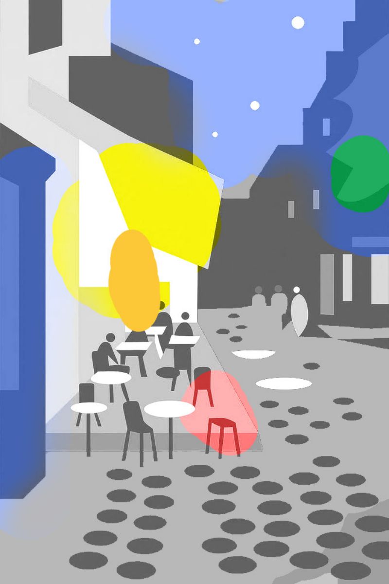 The light values of yellow and orange oppose the blues and blacks of the night. This chromatic tension structures the scene and directs the gaze toward the terrace. The converging lines of the cobblestones and façades lead to the luminous center, while the starry sky and lateral shadows open the composition. The whole rests on a contrasting structure where each color zone contributes to the overall balance.